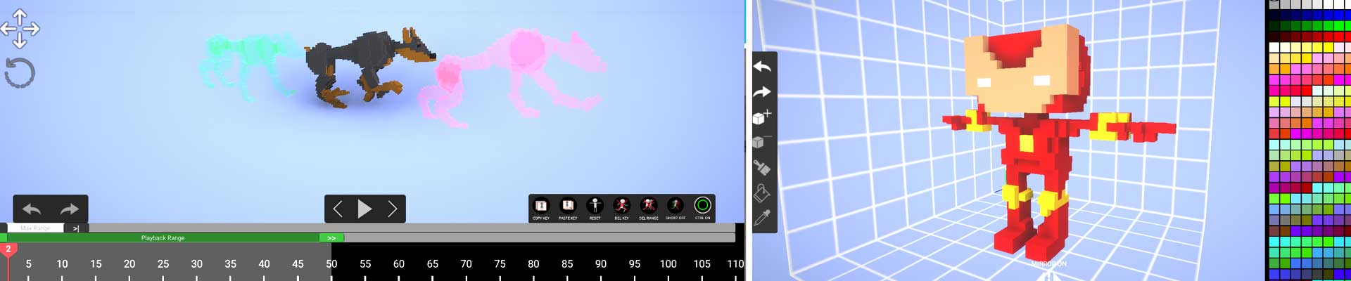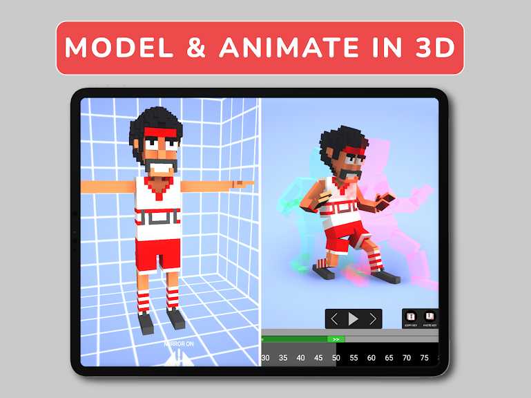 Easily create and animate 3D Voxel characters on mobile and desktop. Model using the in-built voxel editor and then animate a 3d character with keyframes and inbetweens,using onion skin guides in order to pose your characters.